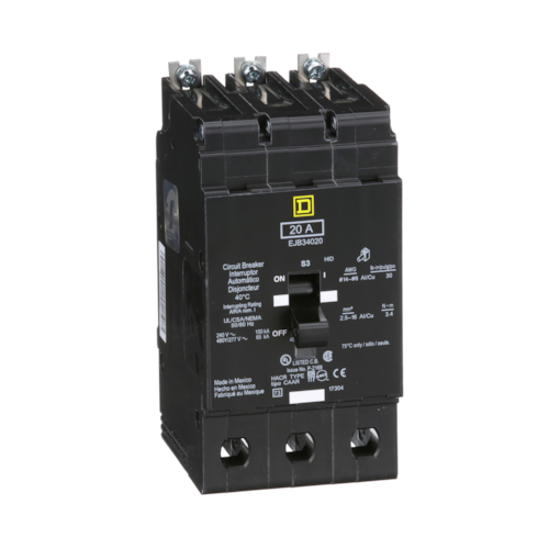 E-Frame Breaker are Lighting Panelboard Circuit breakers that are proven effective and reliable which provide a wide variety or robust features that are use specifically in Square D NF Panelboards. This device is a 3 pole bolt-on breaker that is rated at 20 A at a system voltage of 480Y/277 VAC and the breaker is UL Listed as well as CSA rated. This E-Frame breaker has thermal-magnetic trip unit as well as signal indicator that will indicate when a trip has occur. This specific breaker is HID rated and HACR rated. The breaker has aluminium lugs which have a terminal lug rating of AWG 12...AWG 6 (aluminium) and AWG 14...AWG 6 (copper). This E-frame breaker breaking capacity has been tested a numerous voltages but at two voltages the capacity is 65 kA at 480Y/277 VAC and 100 kA at 120/240 VAC. This device has a hold current of 270 A which is the maxiumum current the breaker can be held to ensure it will trip and a trip current of 875A which is the current value when the breaker is guaranteed to trip. The circuit breaker has a height of 5.66 in, width of 2.94 in and a depth of 4.05 in. This breaker was calibrated for 40 degrees C. This product is UL Listed as High Intensity Discharge. HACR rated.